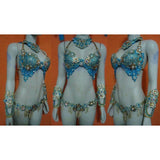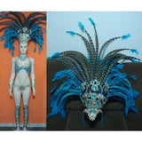 This is a gorgeous blue costume, (with golden strass ss24 and ss28, light blue ss24). There are strass in crystal brooches in the color gold, applied laces in the color blue, golden straps in leather, blue acrylic shantons in blue and various multi colors, rivoles in irridecent colors and sizes, golden laces, golden loops, blue crystals fringes in the bottom bikini wear, golden flower brooches, blue rooster tails e pheasant feathers. There are 20 pheasant feathers! Our Passista Wear carnival designer has a long success with carnival queens, muses and samba divas in Brazil.