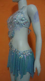 What a gorgeous style and color!  This is a very bling-bling piece that is perfect for every samba occasion you might be involved. The front piece is made of irridescent shanton acrylic stones and rivolis over Lycra. The skirt is made with a metal fabric that is dyed to match the stones and acrylic stones hue of blue!. The beautiful detail we like in the skirt is how the upper hem line goes downward, showing the dancers hip bones which is very flaunting and nice when you samba dance. There is a booty shorts underneath the flowy skirt to hold the outfit together. The outfit closes with a Lycra tie back. If you are not sure of your size and would like to send us your measurements, we can together figure out your correct size!
