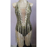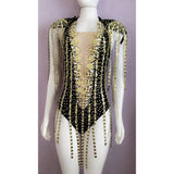 Why we love this look: It's one piece, it has a see through V chest embellished area, it has many many transparent silicon decorated hand cut trims, beads all over the front and back, the back side has a beautiful massive ring that holds 5 back straps. The straps gets attached by a back horizontal back support piece and it's reunited with the lower back trims. It's simply different and when you dance there are lot's of movement and sparkle!