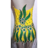 Need a notch up your existing samba wear? Having a Brazil themed wear is a great way to get more gigs. This Brazil collection with hand cut "flames" embellished sequins, rhinestone threads and see-through cutouts. The wavy sequinned cutouts are placed right on the waist & hip line, perfect for your samba dance moves. Do you have a group and need to dress them up? We can make this style in any color your wish, with any color combo. Add a beautiful headdress, arm & leg pieces and you are ready to shine. Perfect for a corporate event if you need a costume a bit more covered up.