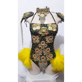 Why we love this look? If you love black and accentuated feathers on your hips this is the perfect look for you that needs to have your back a bit more covered. It has an abundance of acrylic and rhinestones, plus a gorgeous shoulder piece to make you look powerful and samba ready. This is a true show stopper!