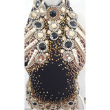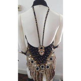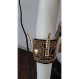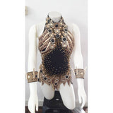 Why we love this look? Afro inspired dresses and costumes are used in many samba schools either for rehearsal or for it's theme, that is the origins of samba. It's a pleaser look that is always welcomed for its exotic and sophisticated look. We love this design because it has animal print on the embellished adornments on the bust and sides.Adding to this details, the designer concentrated the embellished design on top and bottom of the one piece with a mix of gold, black stones, silver, gold rhinestones threads and tiger tooth. The back has a beautiful slim vertical strap that links to the bottom. It's just breathtaking! This style comes with headpiece, arm cuffs.
