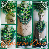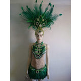 This specific "passista" dress is made with Lycra in a nice Brazil green bold color. There is a middle section that is made with a "second-skin" transparent and fabric with hand applied crystals. The back is adjusted with the same color Lycra with a tie-knot on the upper portion that can be easily adjusted. The skirt is done with a nice sized feathers that overlaps with the bottom feathers. The waist line drops below the belly button to show the curvy waist, and has a nice gathering of many stones and crystals. The top has a well proportioned design with hand placed stones and crystals and a fun selection of bigger crystals on the lower edge. We like that the designer added a choker like necklace to the top of the dress...it looks very glamorous