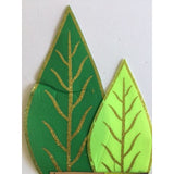 - This leaf is very light-a very thin layer of foam on the back, polyester shinny and printed with glitter on the front-choice of gold or green glitter.