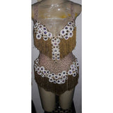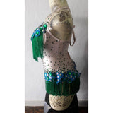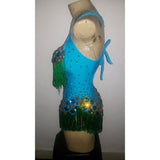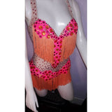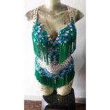 Why we love this dress? If you love a more covered up look, this is perfect. It looks like it's a two piece, but it's one. It has a nice V cut bust line, ending with fringes and embellished stones. Smaller stones are sprinkled all over. This is what a samba dancer wears to be seen in Brazil. So we have it for you now at our shop.
