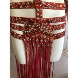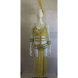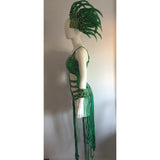 Why we love this dress? When our designer did this very sexy long fringe one piece outfit with many stones and endless accessories we simply loved it! It has a gorgeous rib cage belly design detail, it holds well on the bust, it has side zipper to easily put the dress on. This look comes with a beautiful feathered head piece that compliments elegantly with the long classic line. This is a dress to impress! Some styles will open on the bottom with hooks. Comes with a wide pair of bling cuffs.