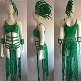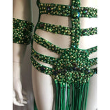 Why we love this dress? When our designer did this very sexy long fringe one piece outfit with many stones and endless accessories we simply loved it! It has a gorgeous rib cage belly design detail, it holds well on the bust, it has side zipper to easily put the dress on. This look comes with a beautiful feathered head piece that compliments elegantly with the long classic line. This is a dress to impress! Some styles will open on the bottom with hooks. Comes with a wide pair of bling cuffs.