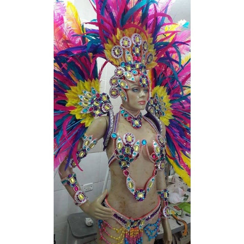 Bikini costumes are slightly different than a trikini or one piece bikini costume and has been a classic costume piece in the samba wear after the 1950’s.  Bikini costumes trend came from colorful beach wear when woman would parade on the streets of Rio on hot summer days. Slowly the simple bikini set became highly desirable. Today a bikini costume is a must for any Sambista that would like to show their figure. Bikini costume have a top and bottom and it’s design might have a torso belt accessory.