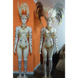 On this costume, the carnival designer used white Lycra cirret, golden acrylic shatons of many sizes, golden strass of sizes ss24 e ss28, golden brooches made of strass, light golden rívoles. There are added details of metal mesh fabric on the outfit, and use of golden lace. Feathers, Beige rooster tails.