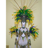 - Includes: Oversized and tall headpiece with removable feathers as shown (roosters feathers, artificial gold feathers on the back and duck on base) neck piece, arm & leg piece (accessories with removable rooster feathers), arm sleeves as show, bikini bottom, bikini top.