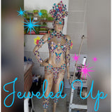 This is a gorgeous 10 piece complete costume with various colors, clear crystals. It has adjustable side hooks on the bikini back bra, bikini side bottom.