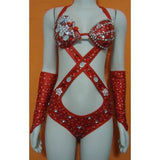 This is a popular samba wear outfit made with Lycra Cirret and silver, red rhinestones stones, acrylic stones and rhinestones thread to embellish the costume. This is a very bling-bling show piece with great care to small details and quality stones. We love this look because it favors the samba dancer's body with the crossed front details, all embellished with silver ans red stones. The body suit closes on the back, with a Lycra tie. The back short bottom has a nice bigger cut; this is done in a way that the bottom shorts stays in place. This look comes with1 pair of samba gloves. Upon request, we can also make ankle embellished leg warmers to match the gloves.
