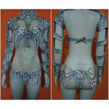 This is a true "passista" costume that is made to last. This costume is designed for you samba professional dancer. This is a beautiful style with many attention to details. We simply love the samba sleeves with cutout swirls, the dangling crystals fringes and the oversize necklaces touching the edge of the bikini top.