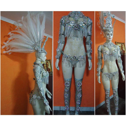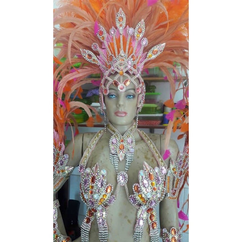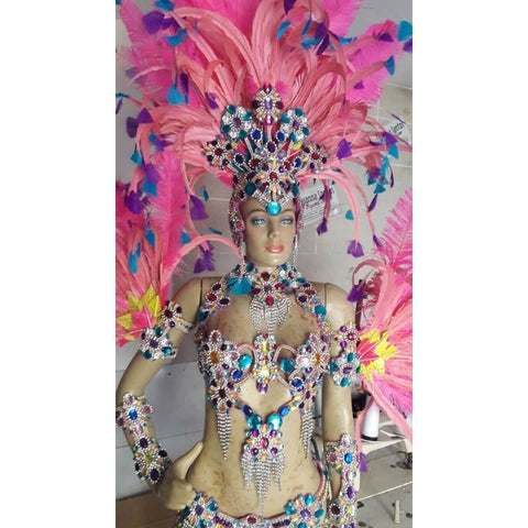 Bikini costumes are slightly different than a trikini or one piece bikini costume and has been a classic costume piece in the samba wear after the 1950’s. Bikini costumes trend came from colorful beach wear when woman would parade on the streets of Rio on hot summer days. Slowly the simple bikini set became highly desirable. Today a bikini costume is a must for any Sambista that would like to show their figure. Bikini costume have a top and bottom and it’s design might have a torso belt accessory.