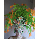 This is a luxurious headpiece that can be custom made to match the colors of your costume beads and in the feathers colors of your choice as well.