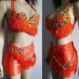 Why we love this look? We adore the updated high waist shorts. Love the Lycra Cirret-which gives this beautiful wet shiny look. If you have the most beautiful samba body ever, this is one look sure to make you have so much compliments! We use only the best high quality stones, acrylic stones and glass stones to give that intense shine. If you need us to use crystal stones like Swarovski please do not hesitate to contact us for pricing. This is a beautiful all elegant and show stopping passista wear. A "all eyes on you" piece! We love the Brazil colors with fringes and so many accessories !
