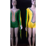 Why we love this look?It's Brazil's colors!! What a great statement if you work with Brazil as your brand. If you are looking for a Lycra romper that is comfortable and sparkly with lots of fringes and stone work, this is it!