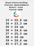 About the shoemaker: Our cobbler has been servicing the local samba schools with the highest quality and dedication. He works alone with a very small staff and each pair is handcrafted with love and care. He understands exactly what the dancers needs; what they like and dislike in samba shoes. His shoes are worn by all the flag bearers couples, drum queens, divas and passistas of samba schools. In Rio Carnival parade, his shoes are the most used by all the samba communities in Rio. Our shoes have traveled and have been tested all around the world by professional samba dancers